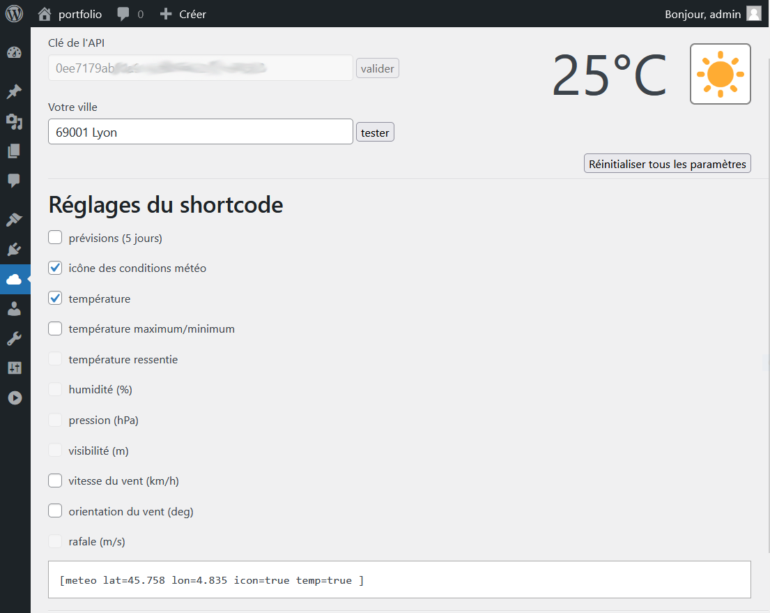 Deux types de shortcodes sont proposés : un classique qui permet de visualisé la météo en direct ou une prévision sur 7 jours
